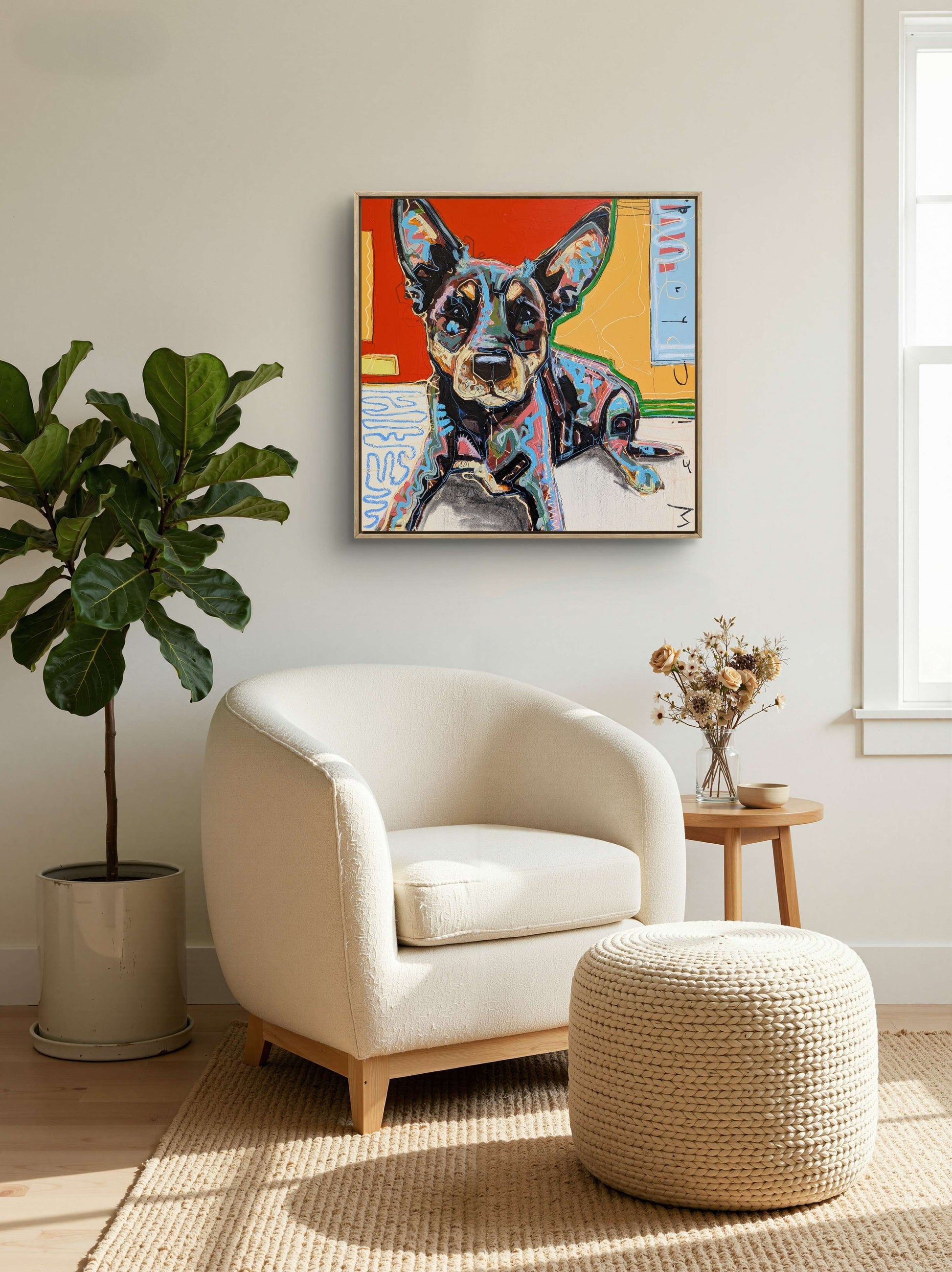 The use of sunburnt orange and sunny yellow this painting attempts to capture the tireless spirit of the working dog, bound to the land and the rhythm of rural life.
