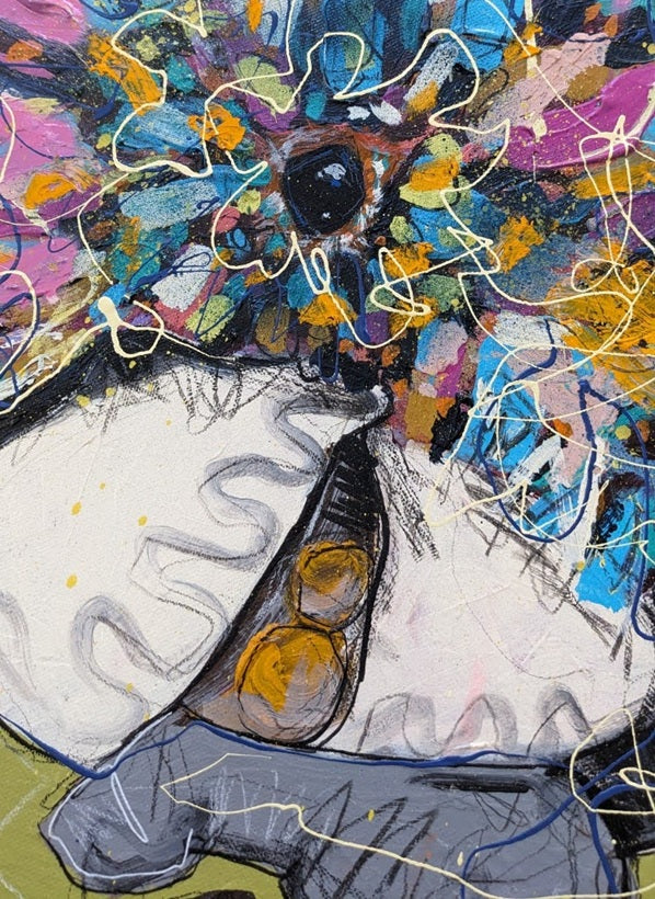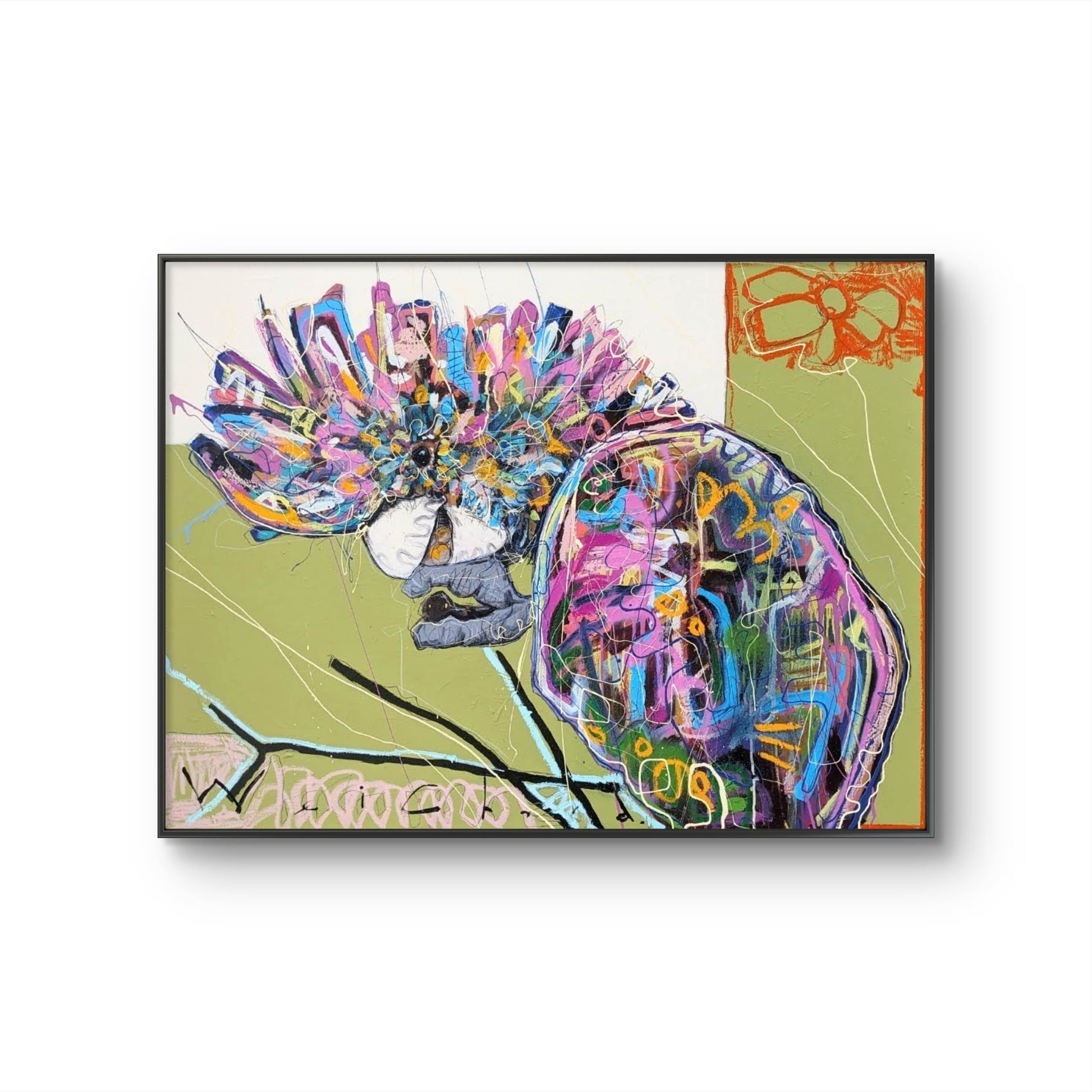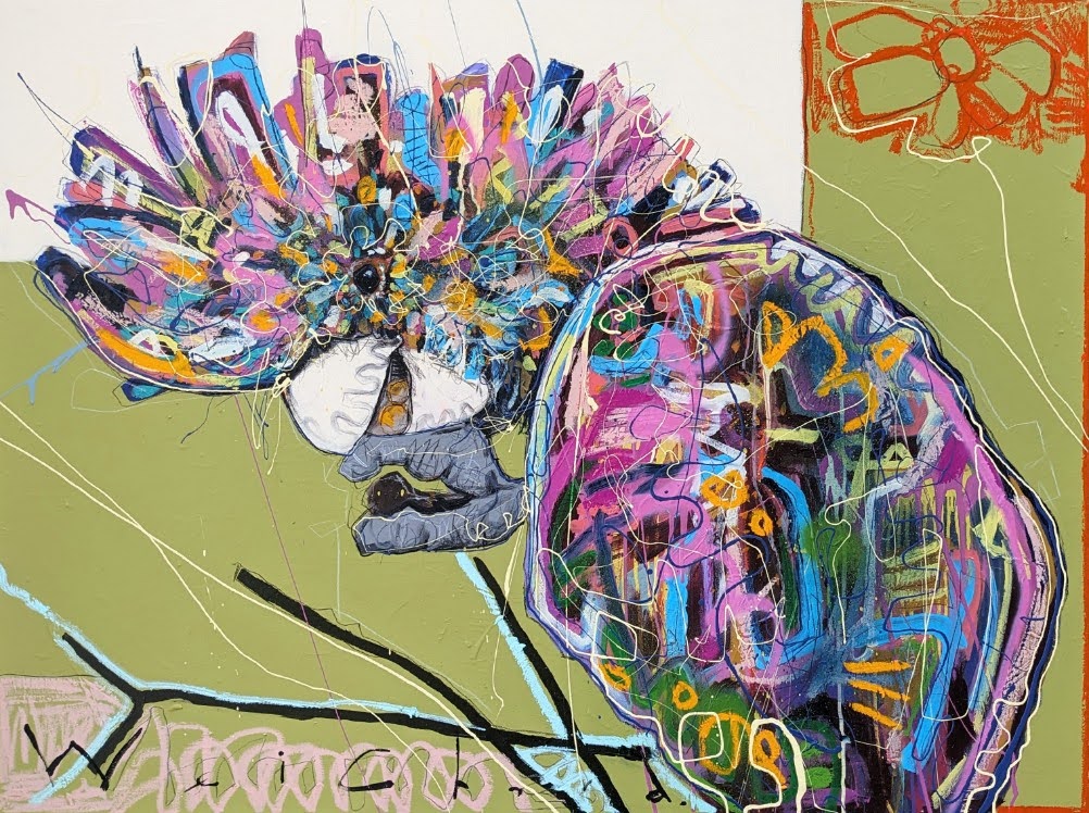 Shadow Snack' is another a multi layered and textured black cockatoo from my native Australian bird series. Using mixed medium and loose enamel edging, the black cocky is boldy contrasted against the green background.