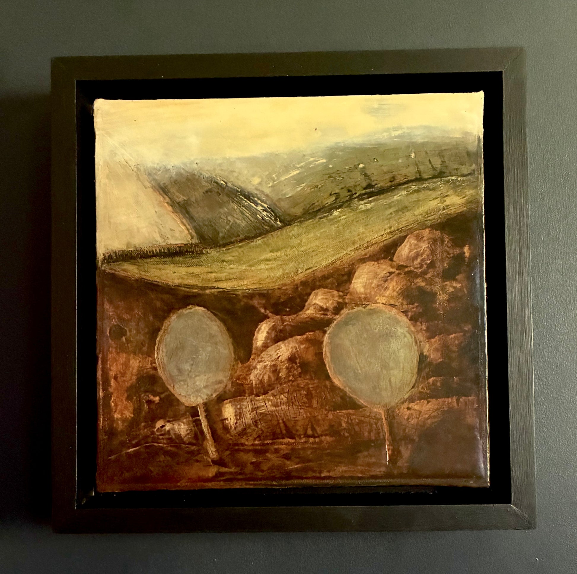 36.5 x 36.5 cm. Mixed media on canvas, framed in black wooden box frame.