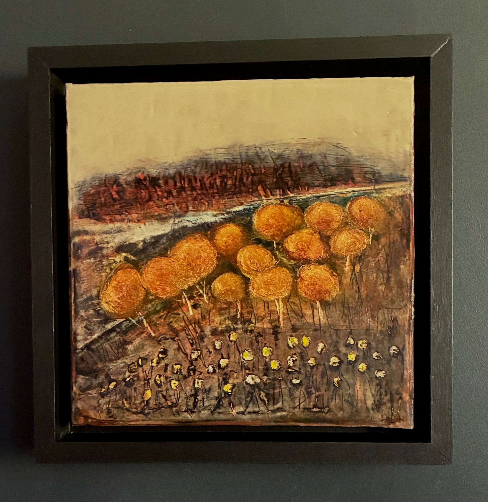 A small semi abstract landscape, the last days of summer, turning colours. Rugged hill in background.