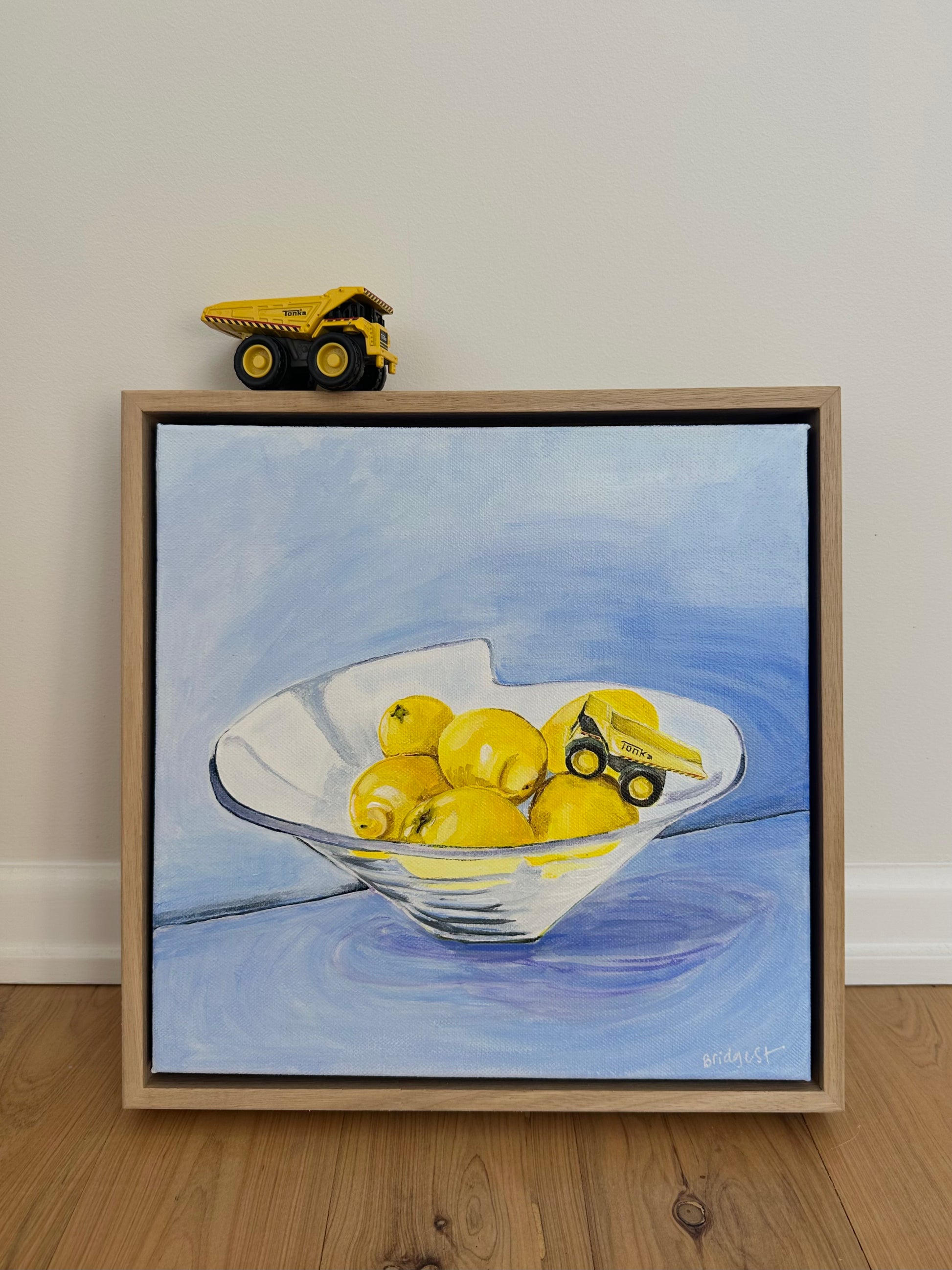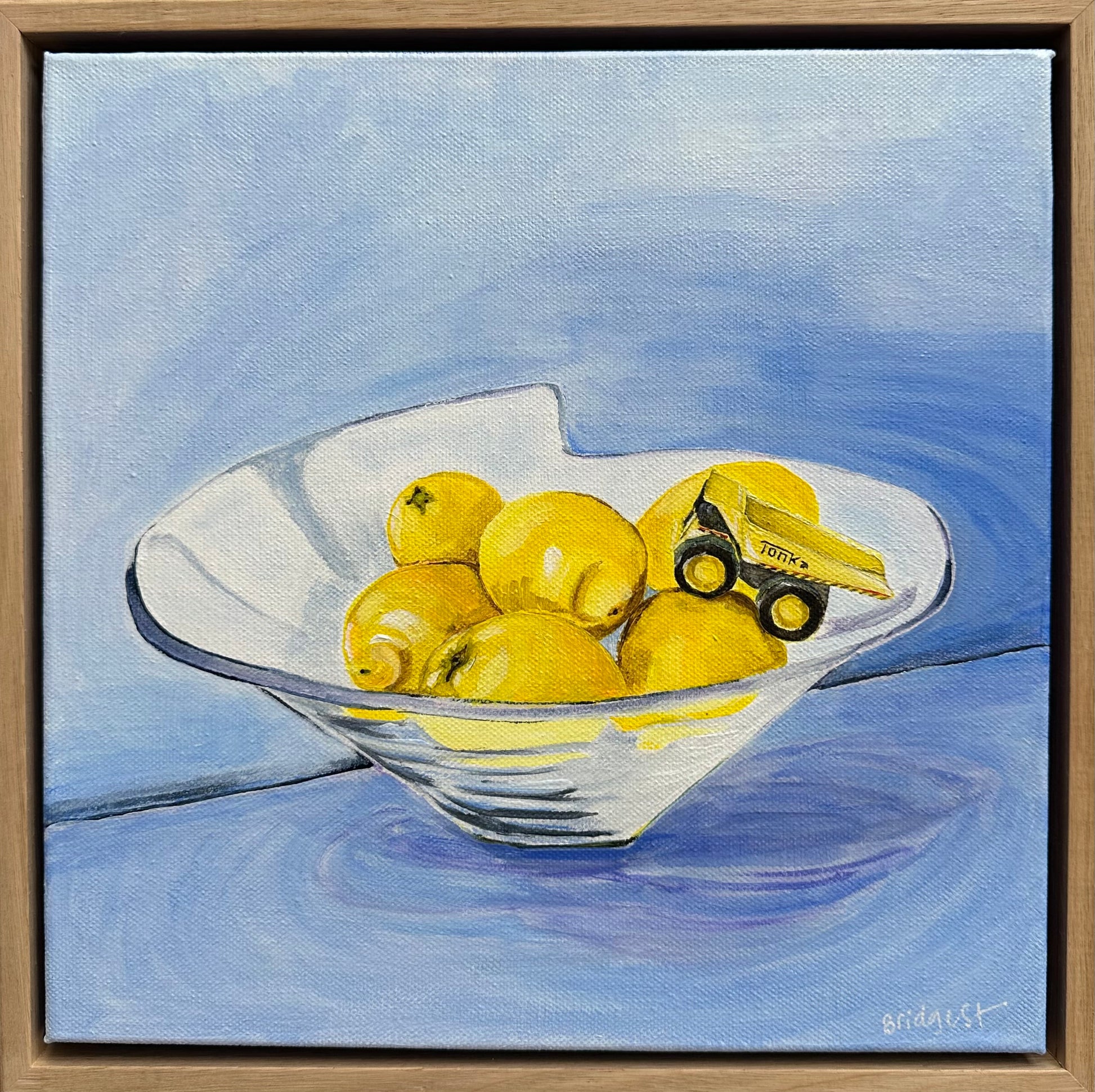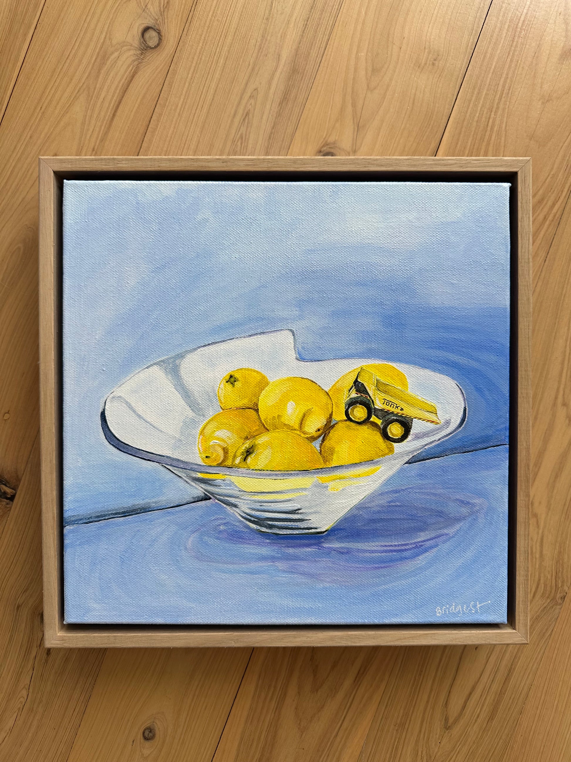 33.5 x 33.5 cm. Acrylic and house paint on canvas, framed in raw Oak.