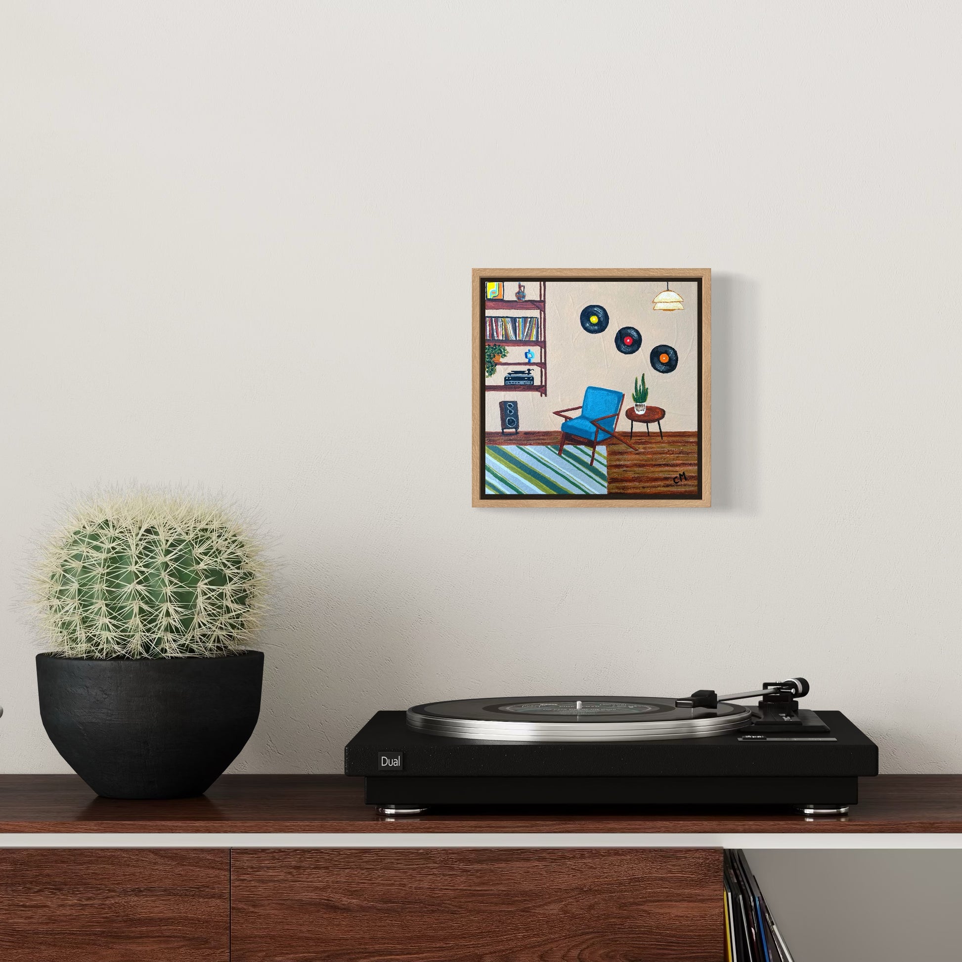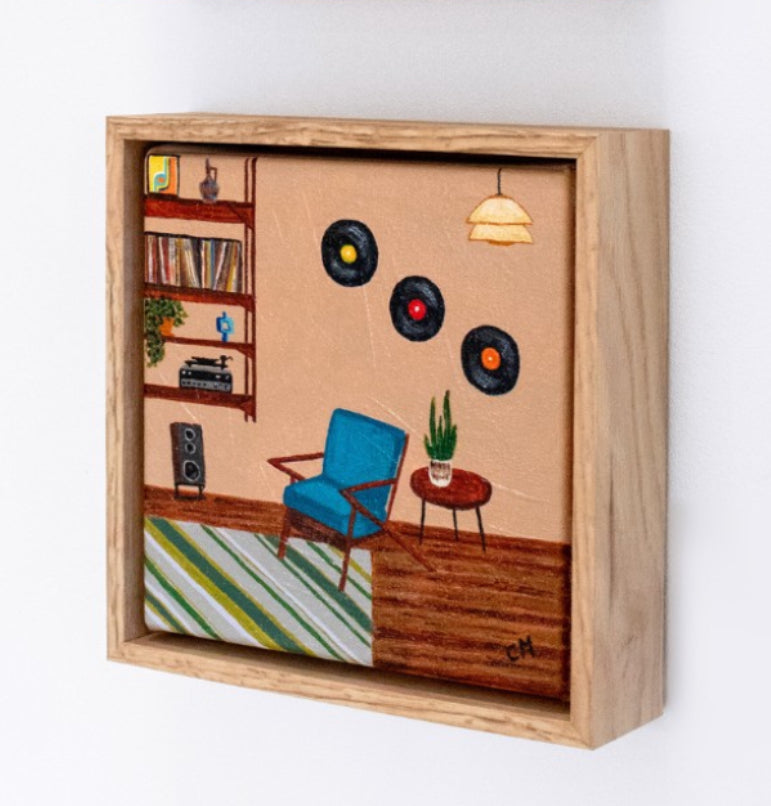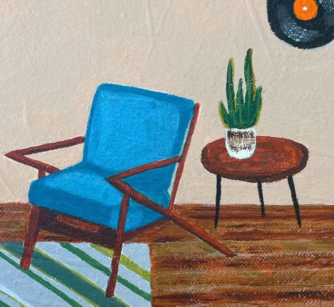 Serenity in Sound features a cozy room with a nod to mid-century design and musical nostalgia. Sit down and relax in the blue chair, listen to your favourite music and be transported back in time.