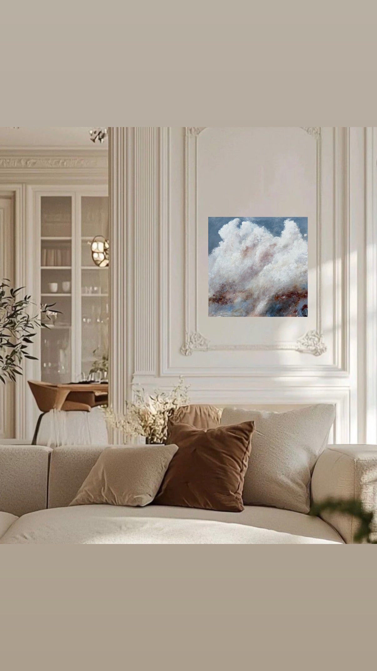 53 x 53cm. Acrylic and mixed media inclusive of earth pigments on linen canvas. Framed in timber.