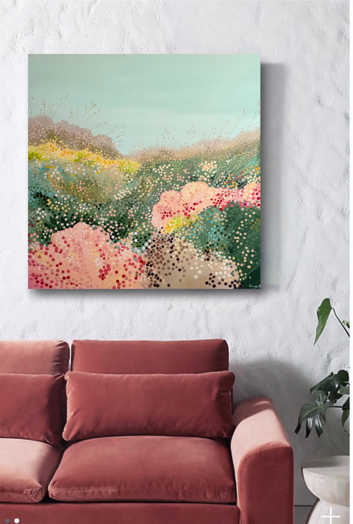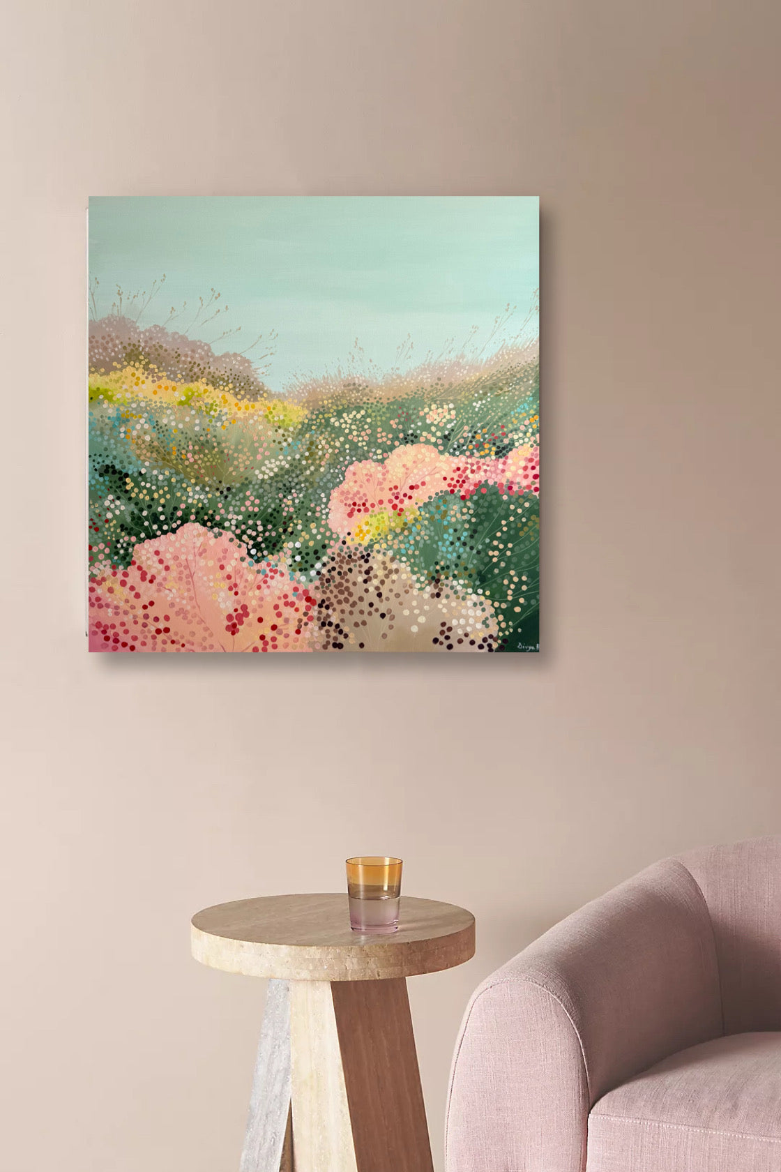 This painting evokes a gentle clearing where subtle pinks and greens unfold beneath a clear blue sky, punctuated by delicate white wildflowers. It captures a quiet, fleeting moment of light and calm.