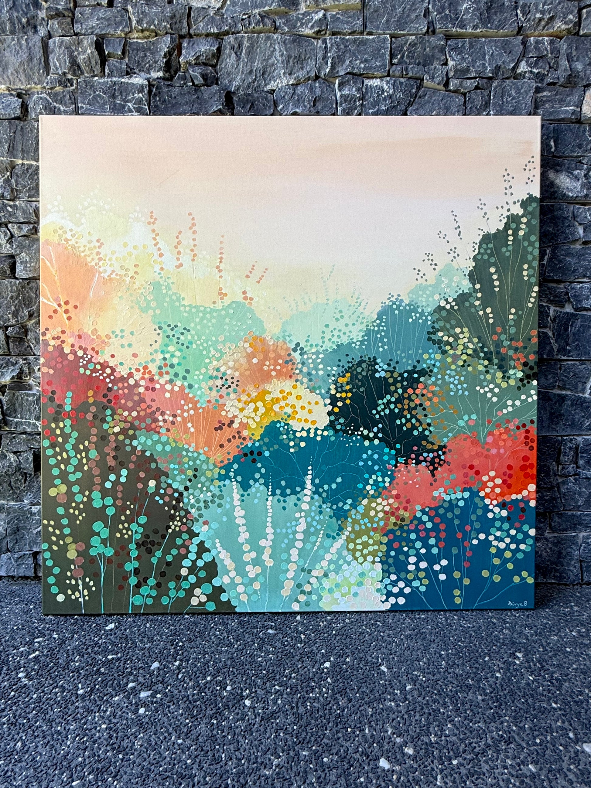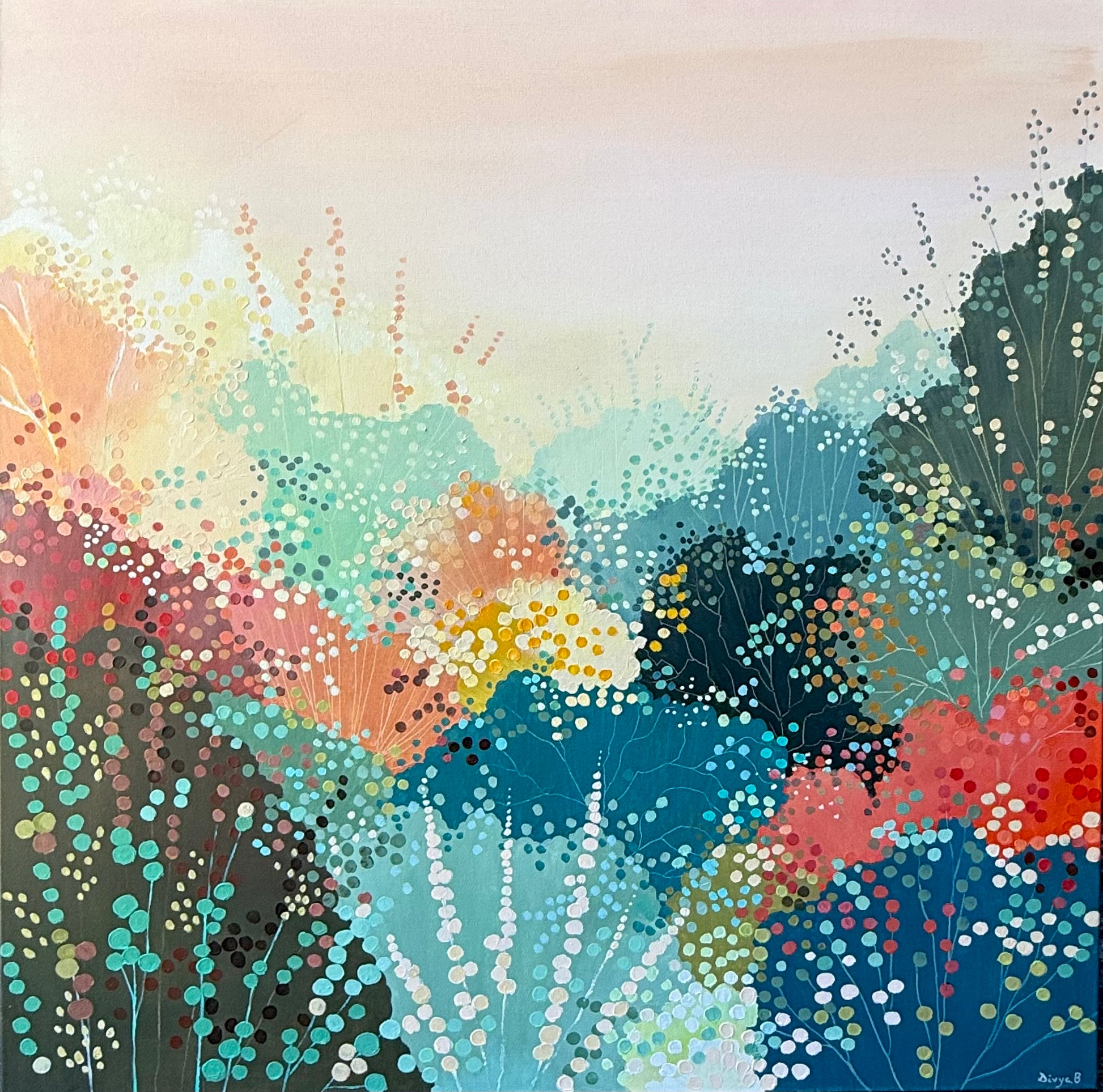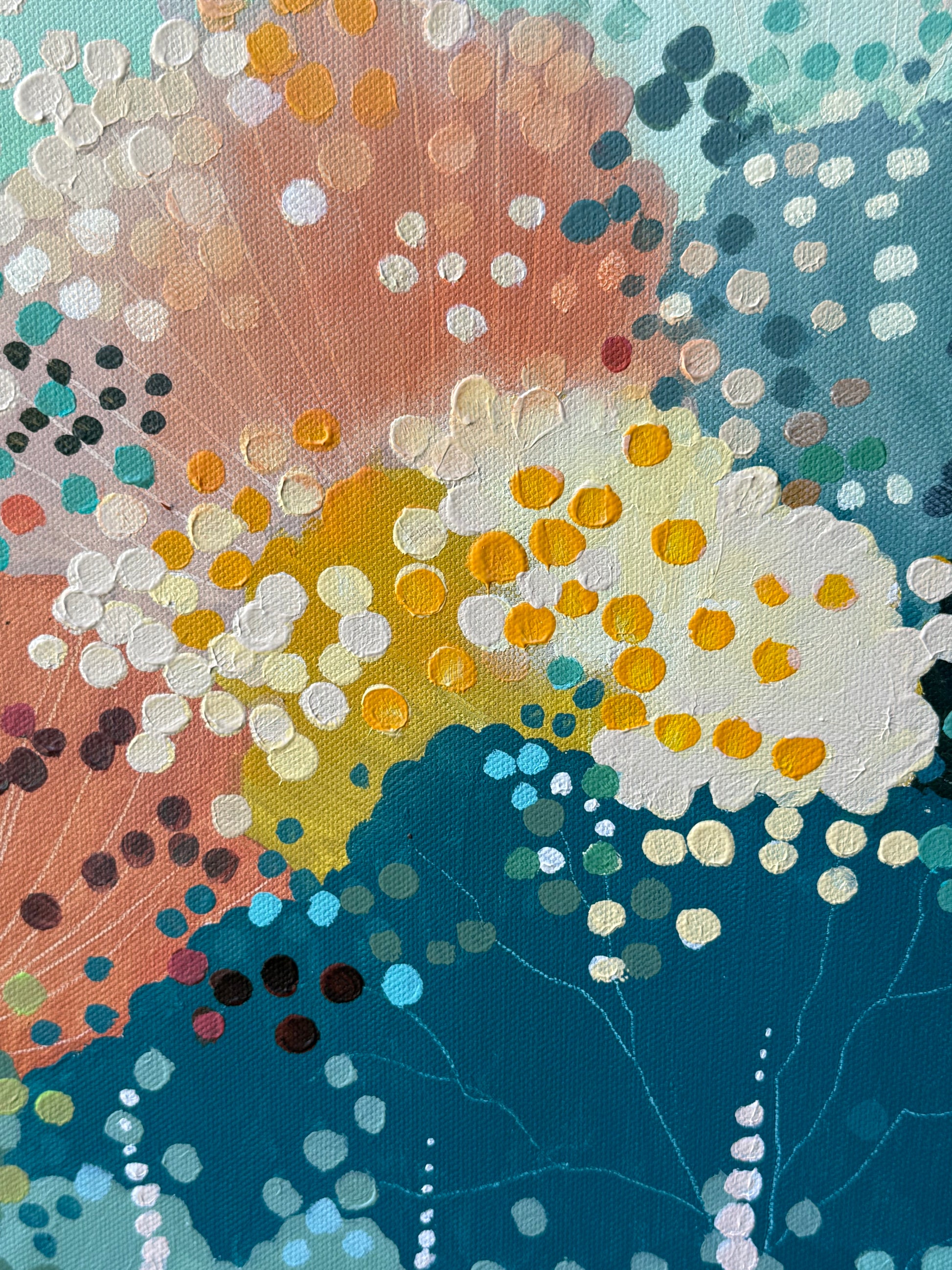 This abstract garden painting captures a feeling of immersion in nature, where layered colour and delicate dot work suggest foliage, light, and movement. It sits between memory and imagination, inviting the viewer to wander and breathe.