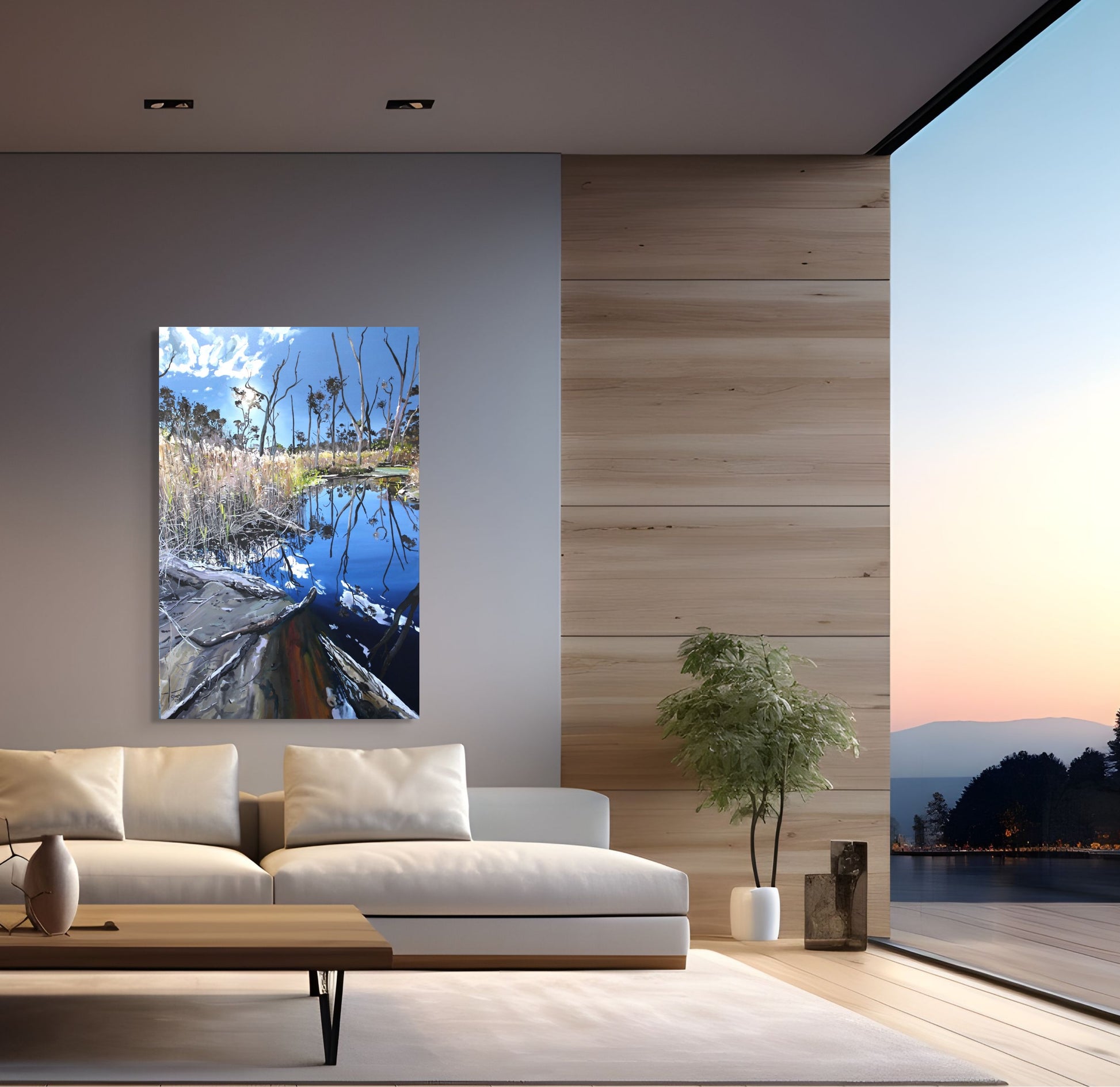 If I were a Cat..Bribie Island would be my sardine!! I spend many hours painting this landscape. This particular work focuses on a Billabong in the early evening. The sun is sinking, and