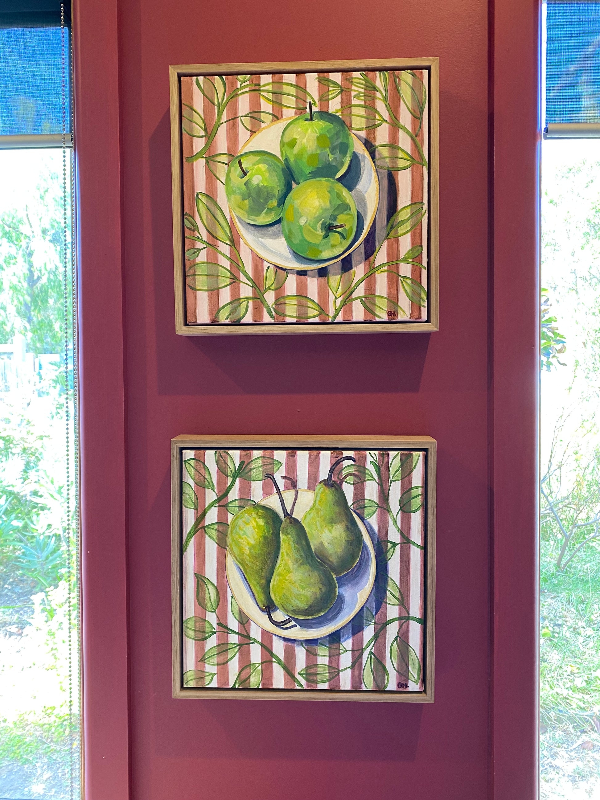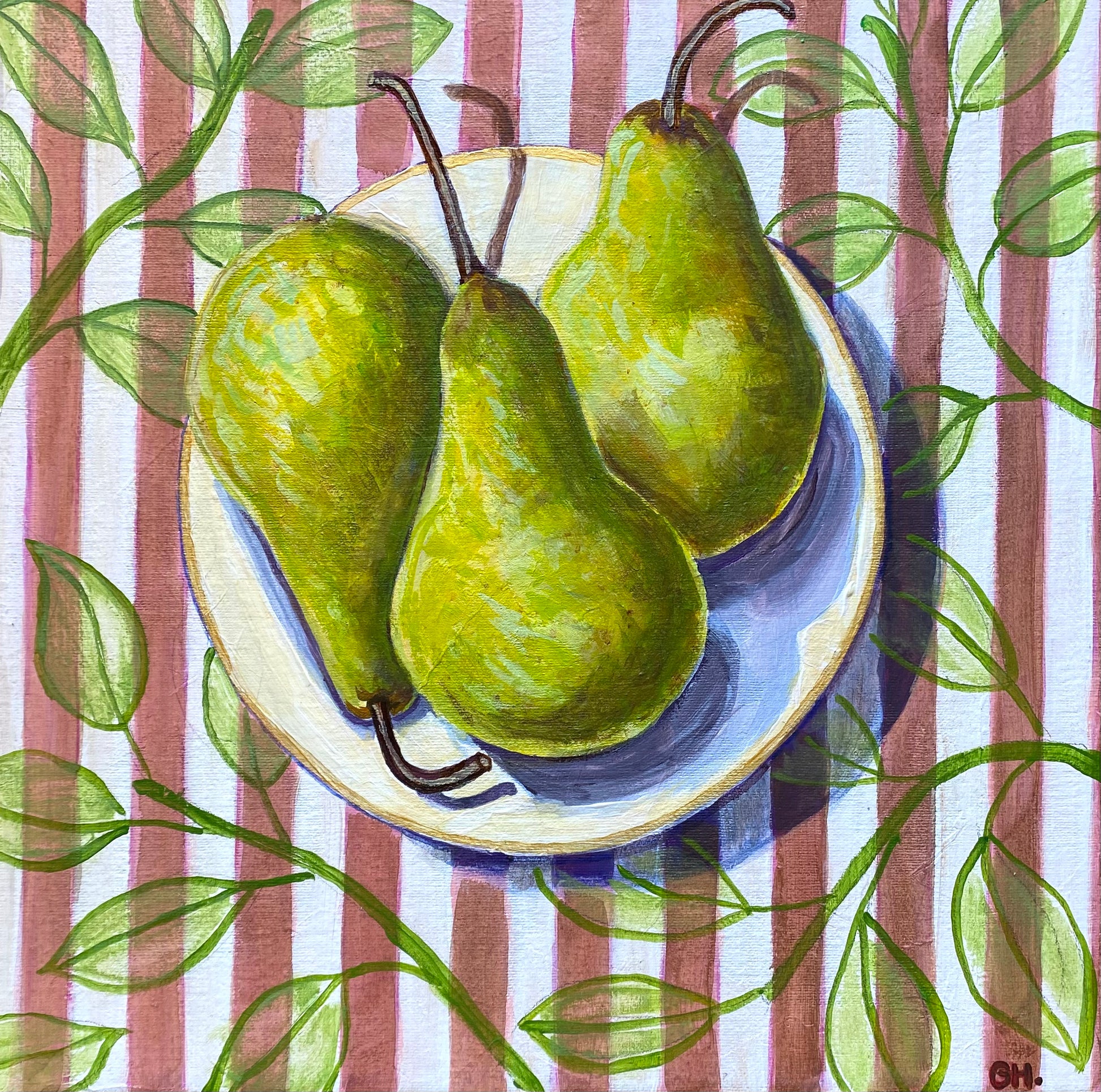 Pears are all individually shaped like people which gives each one a slight personality. I have used a leaf motif over stripes, as wallpaper behind the pears as a way of introducing their leaves without dominating the subject.