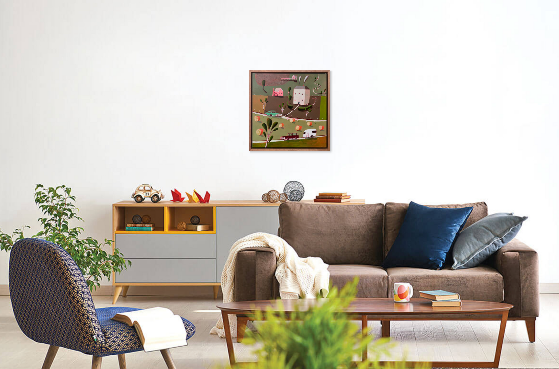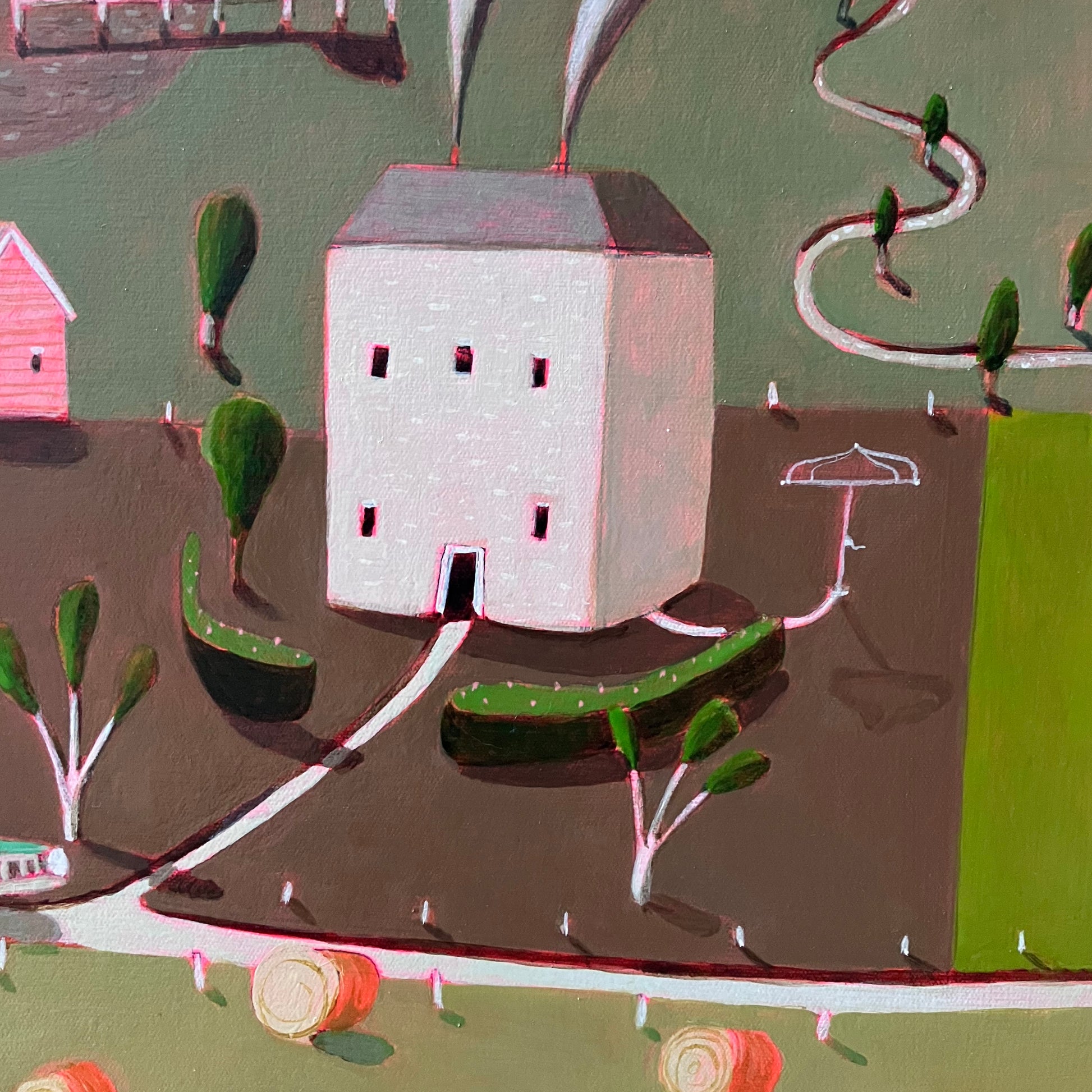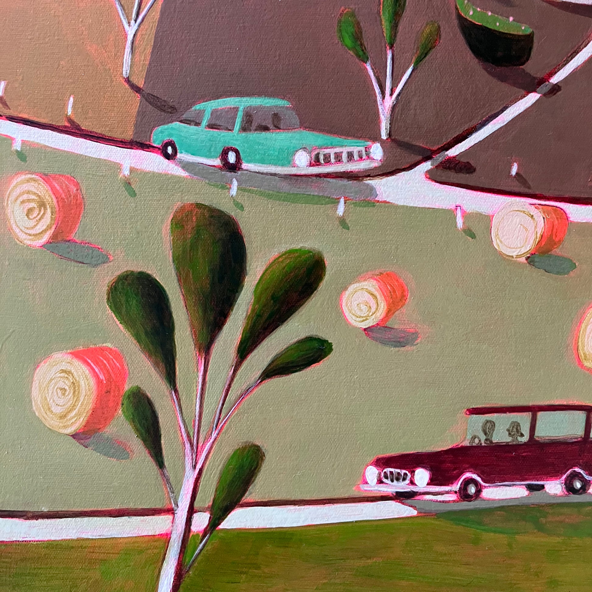 Hay Bails is an imagined landscape inspired by driving through the Heritage Highway in Tasmania. It is am amalgamation of a number of sighted views, I wanted imbue it with a feeling of suspense, as if something dramatic is about to occur.