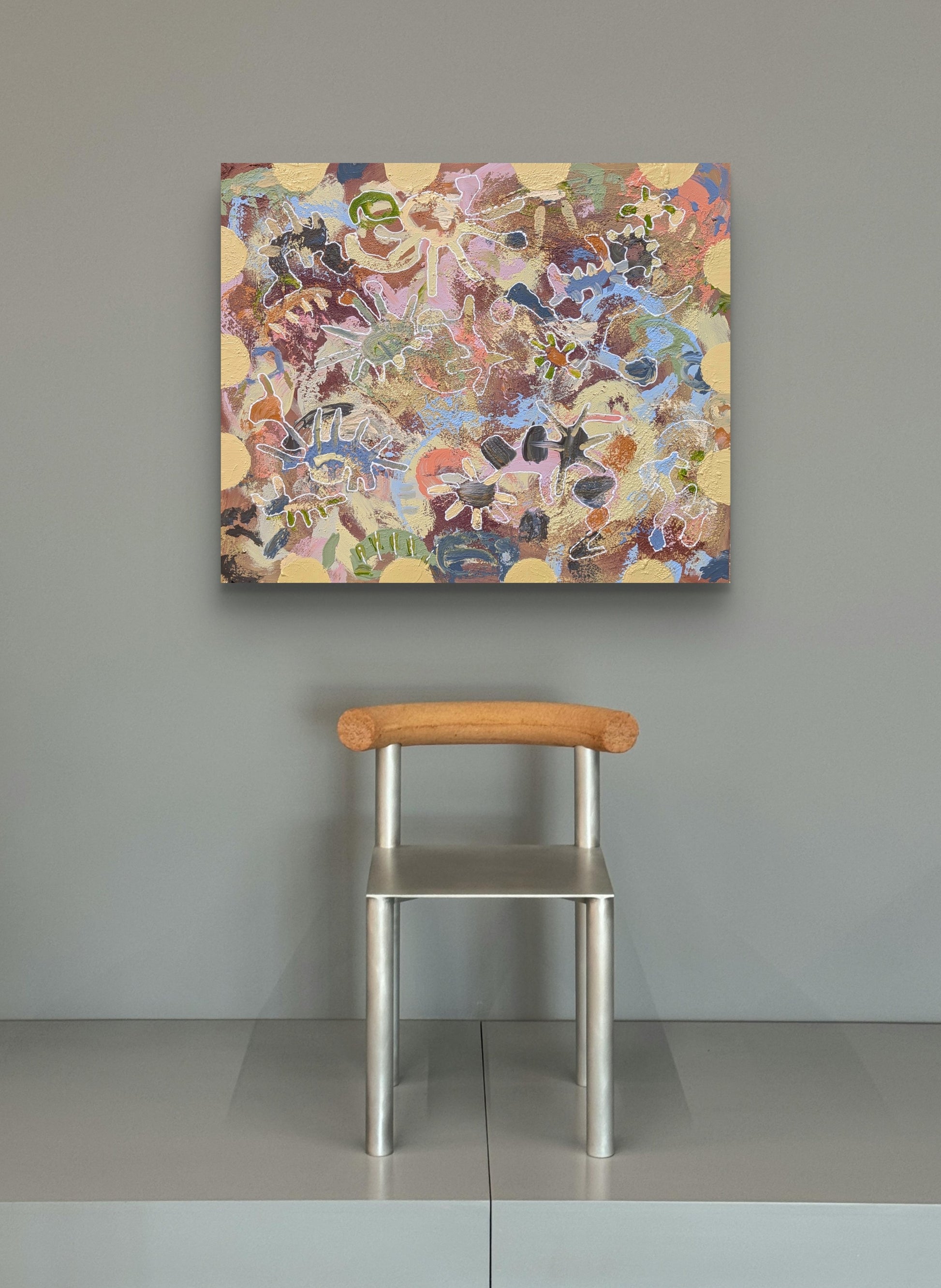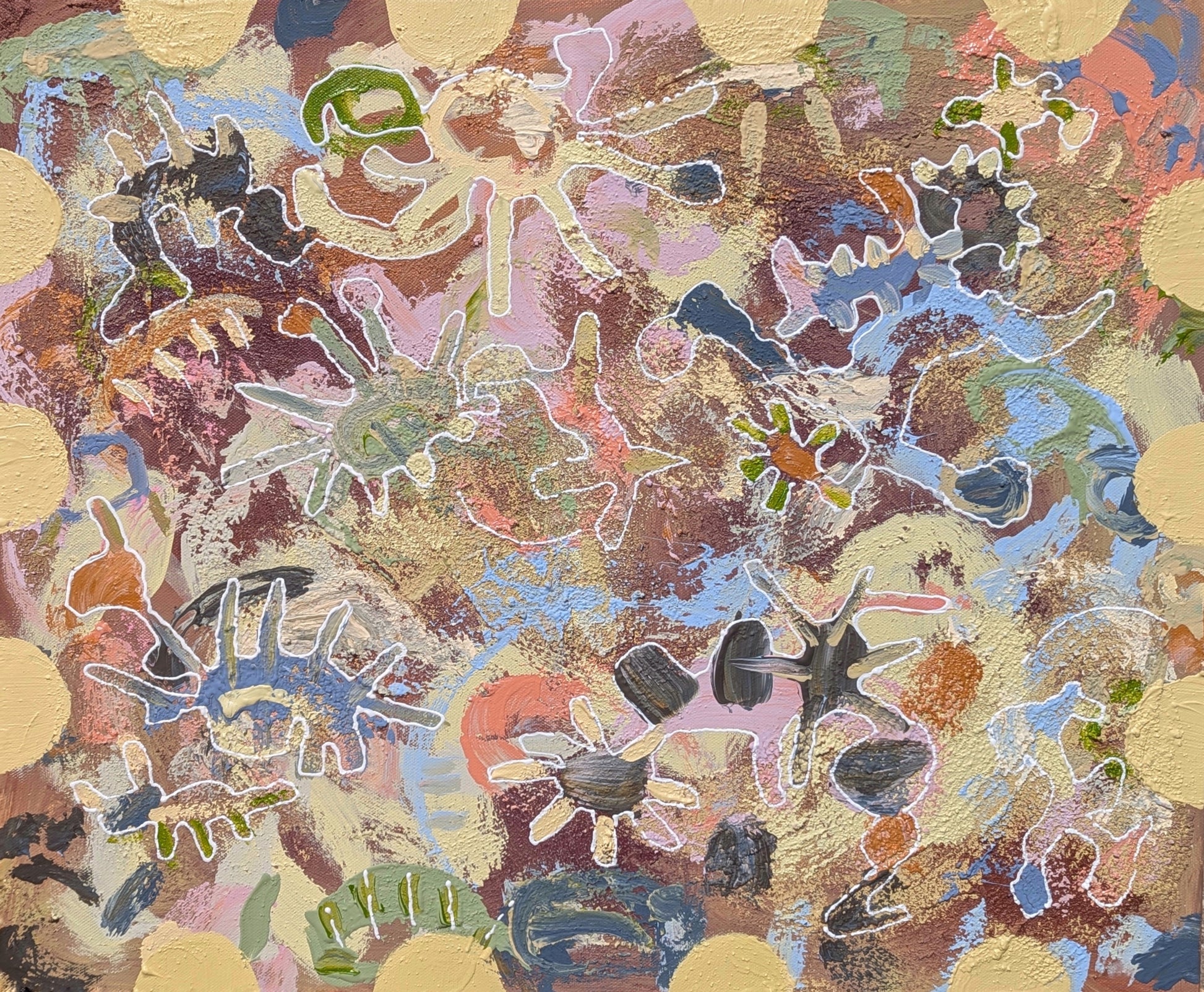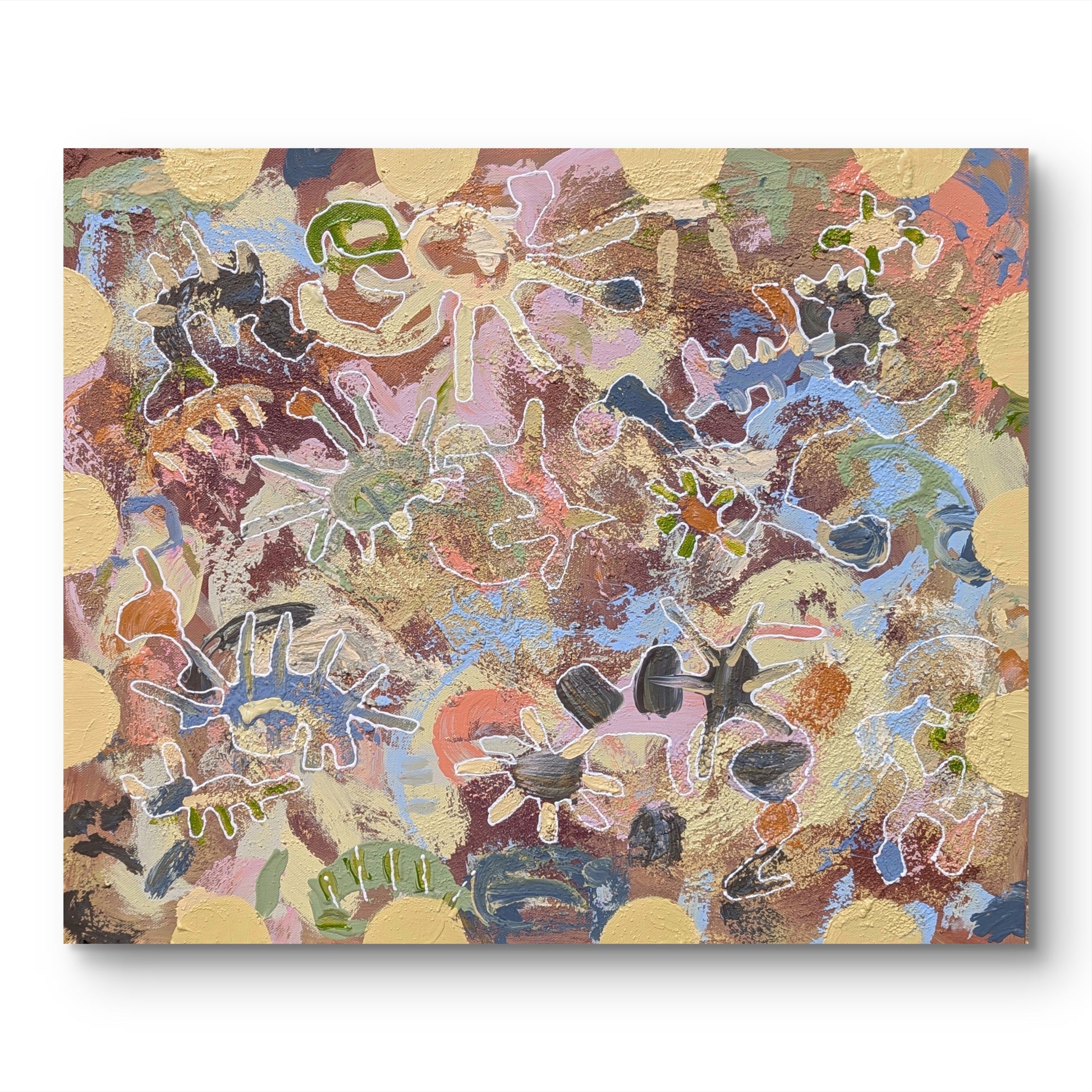 In my abstract paintings, I trace organic forms that emerge naturally. Inspired by the whimsy of childhood and the enduring love of my Avó and Avô, I incorporate playful 'bichinhos'—figures that represent innocence and wonder. By naming each piece in Portuguese, I honour my family and the love that shaped me.