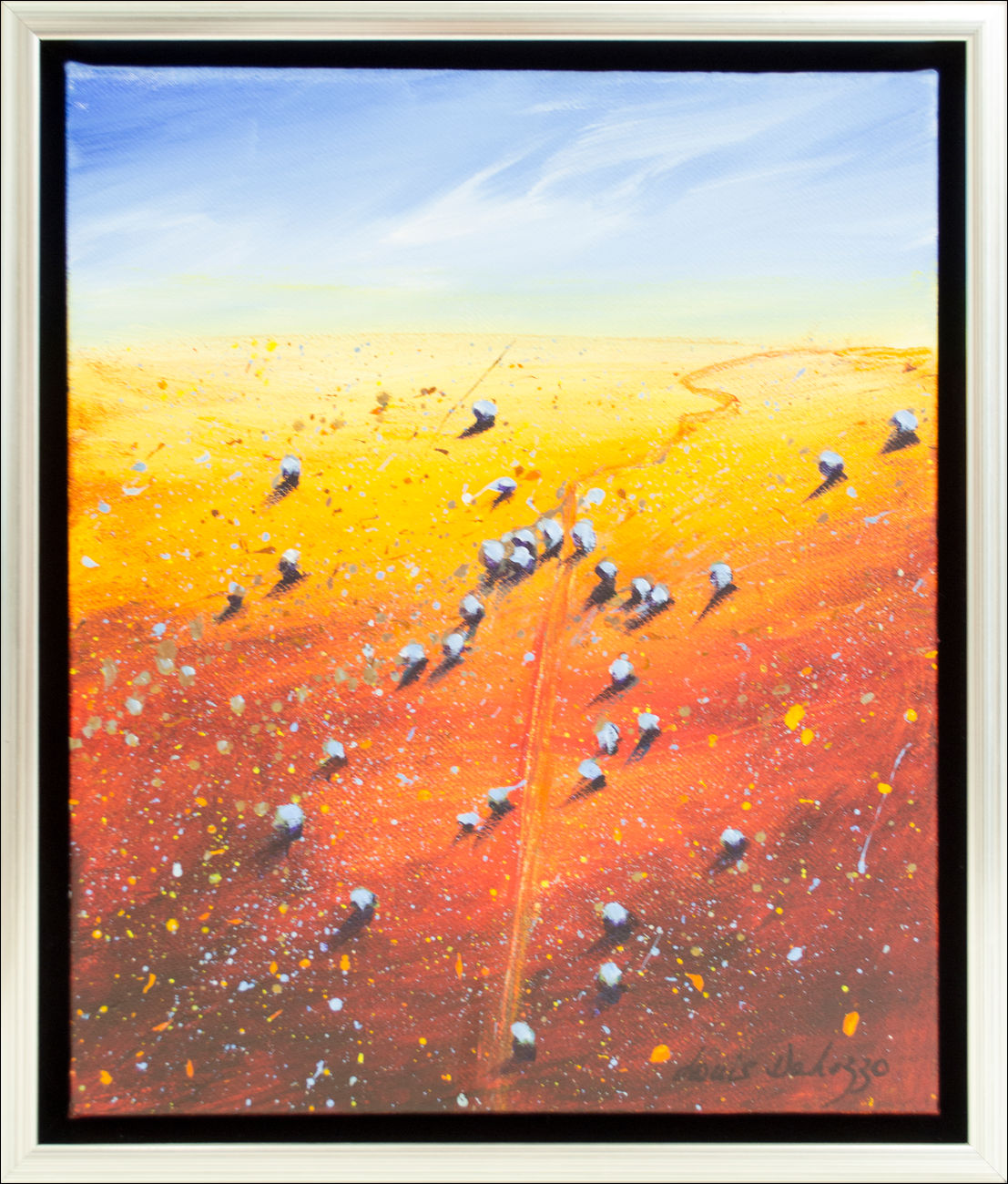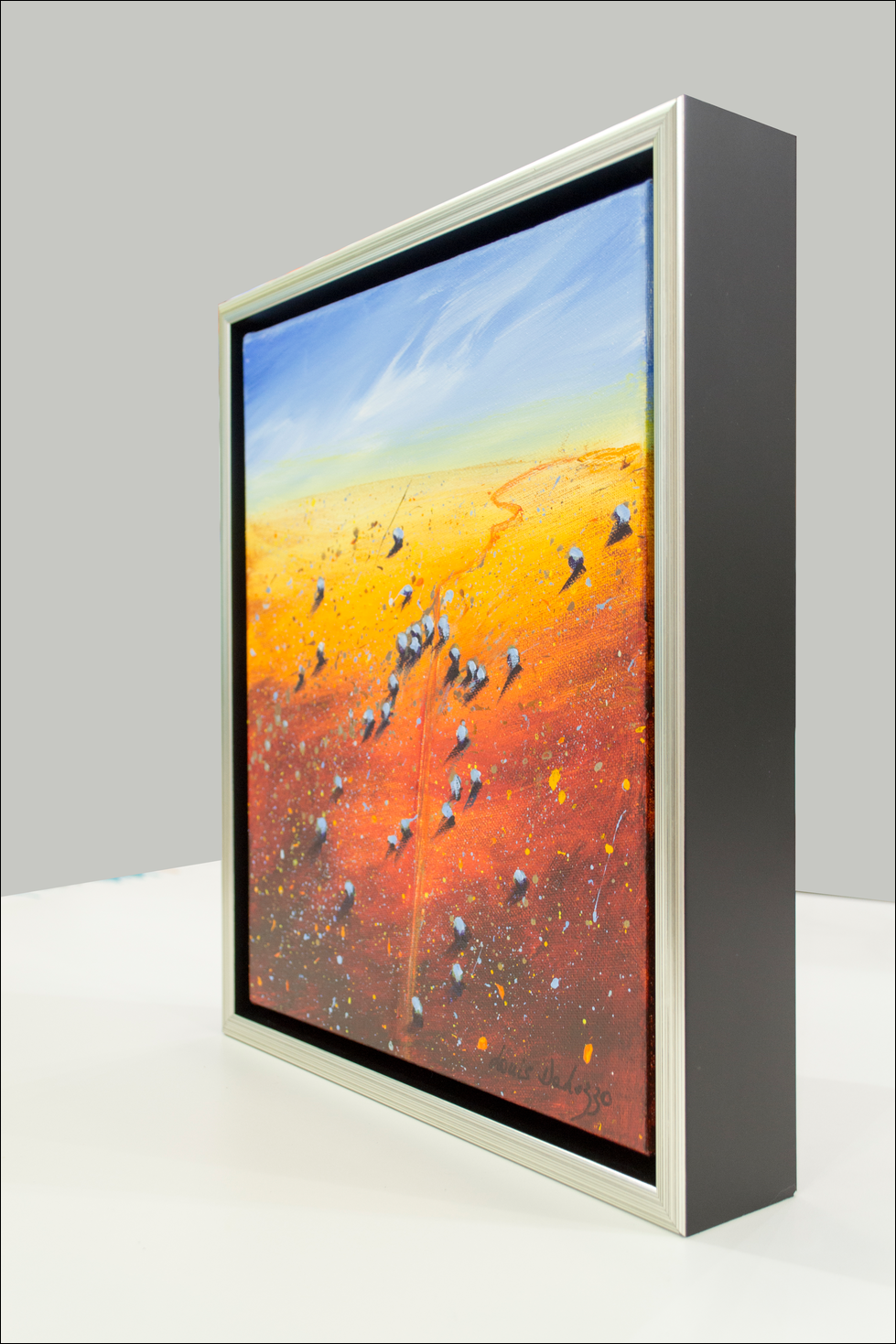 29 x 34cm. Acrylic on canvas, Framed platinum box frame