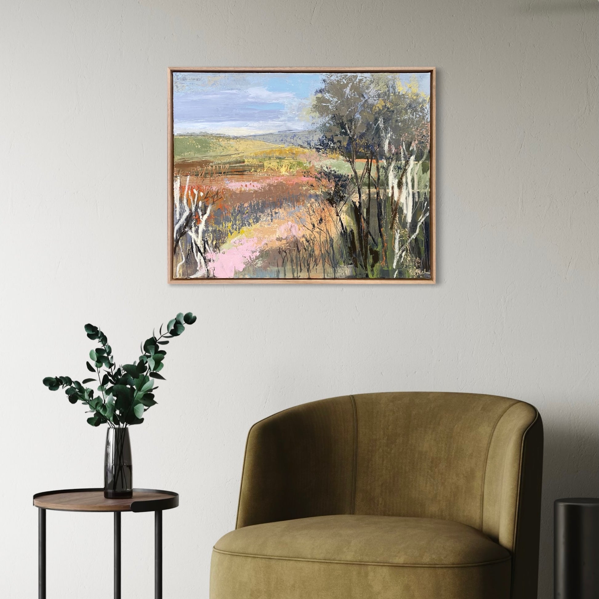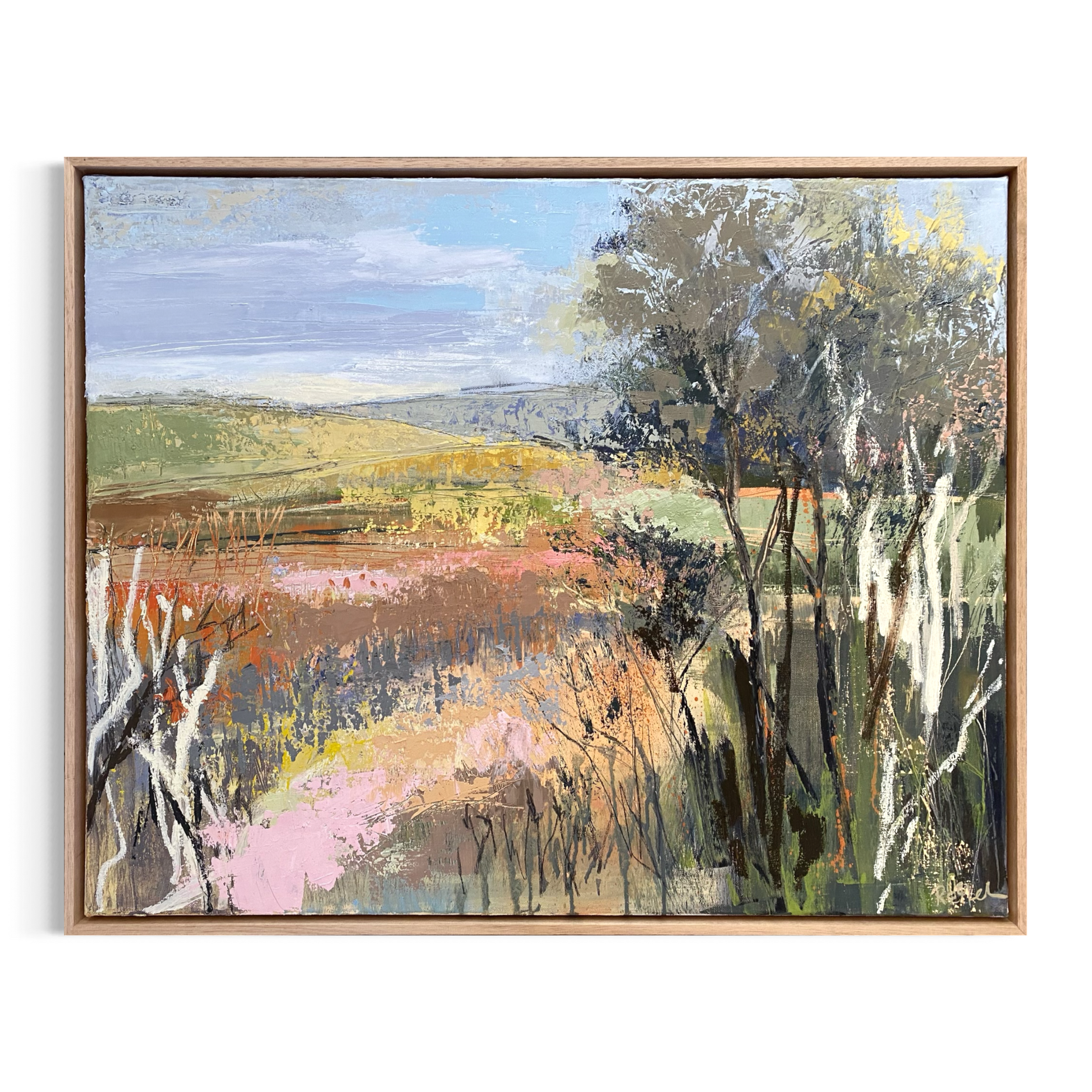 Driving home on a country road, I was entranced by the ever-changing landscape - the hills as they rolled around with each bend in the road and the trees as they whizzed past. My mind picks up subtleties of colour and the details in form to later be translated onto canvas.