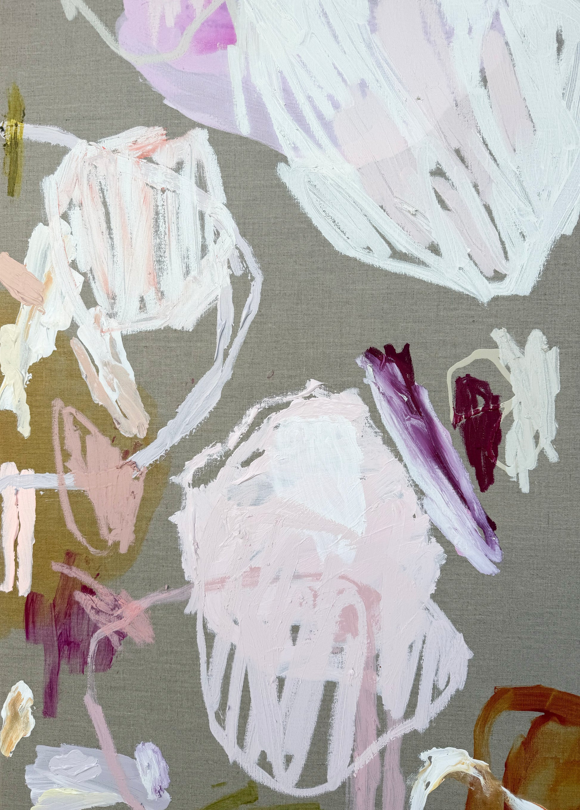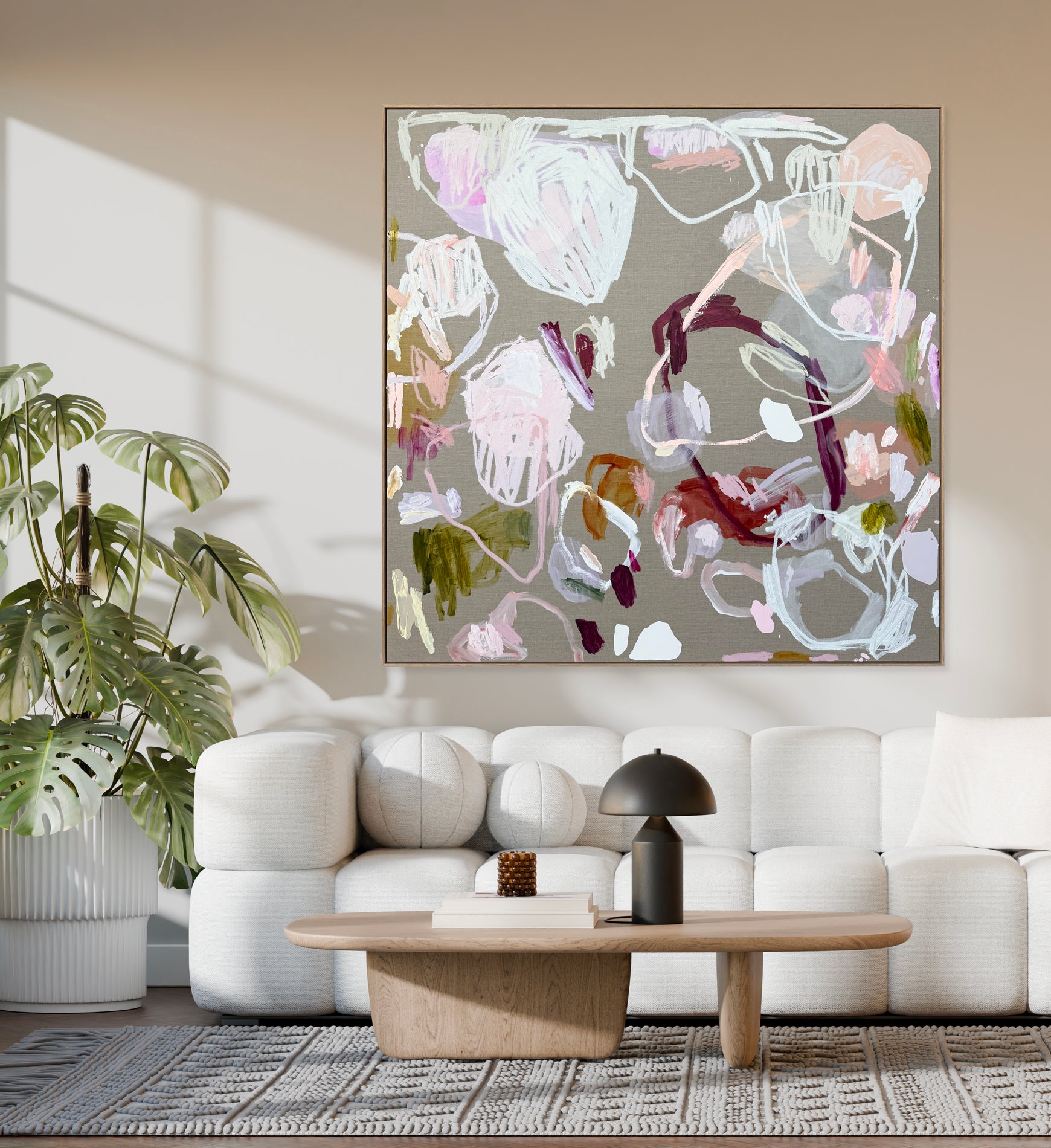 A Little Bit Electric' captures a balance of soft tones and bolder gestures, creating a sense of movement and light across the surface. Painted on linen, this large-scale work adds colour and atmosphere without overwhelming a room.