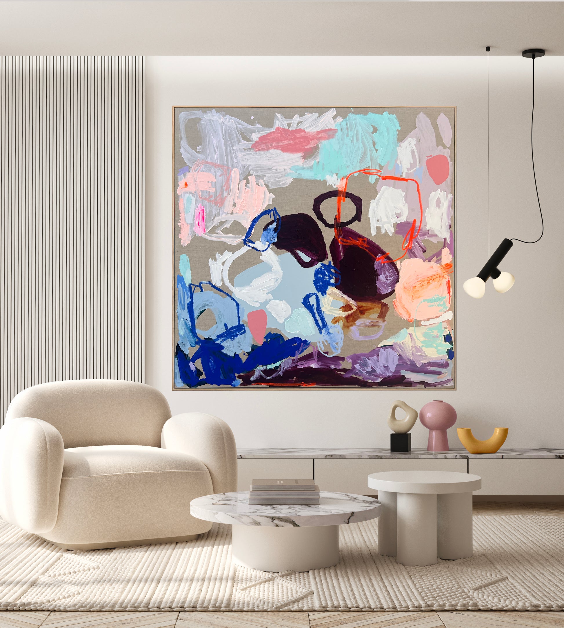 Don’t Rain on My Parade features expressive gestures and layered tones that speak to energy, emotion, and individuality. The raw linen surface enhances its texture and depth, giving the piece a presence that feels both uplifting and personal.