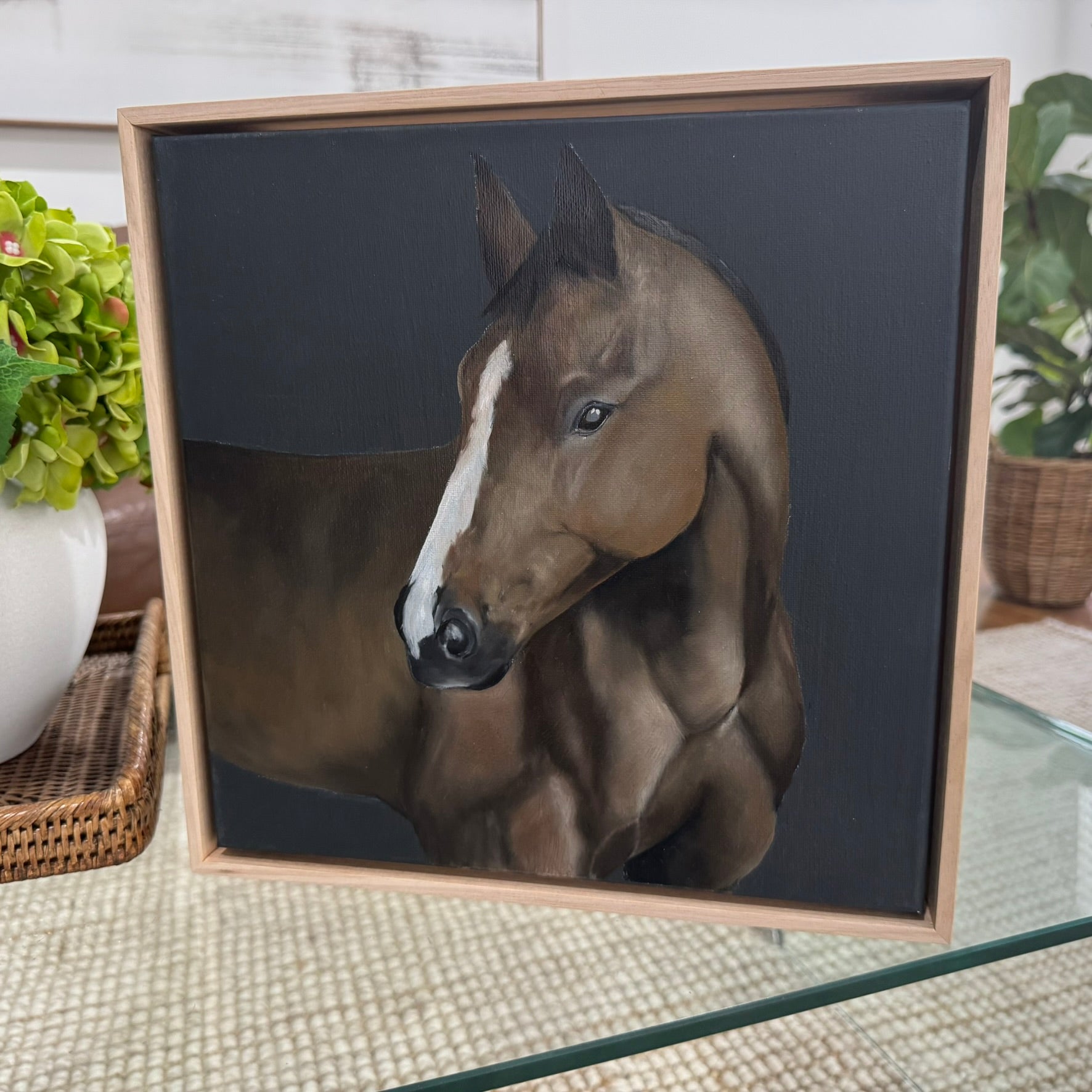 32 x 32cm. Acrylic and Oil on Canvas, Framed in natural oak.