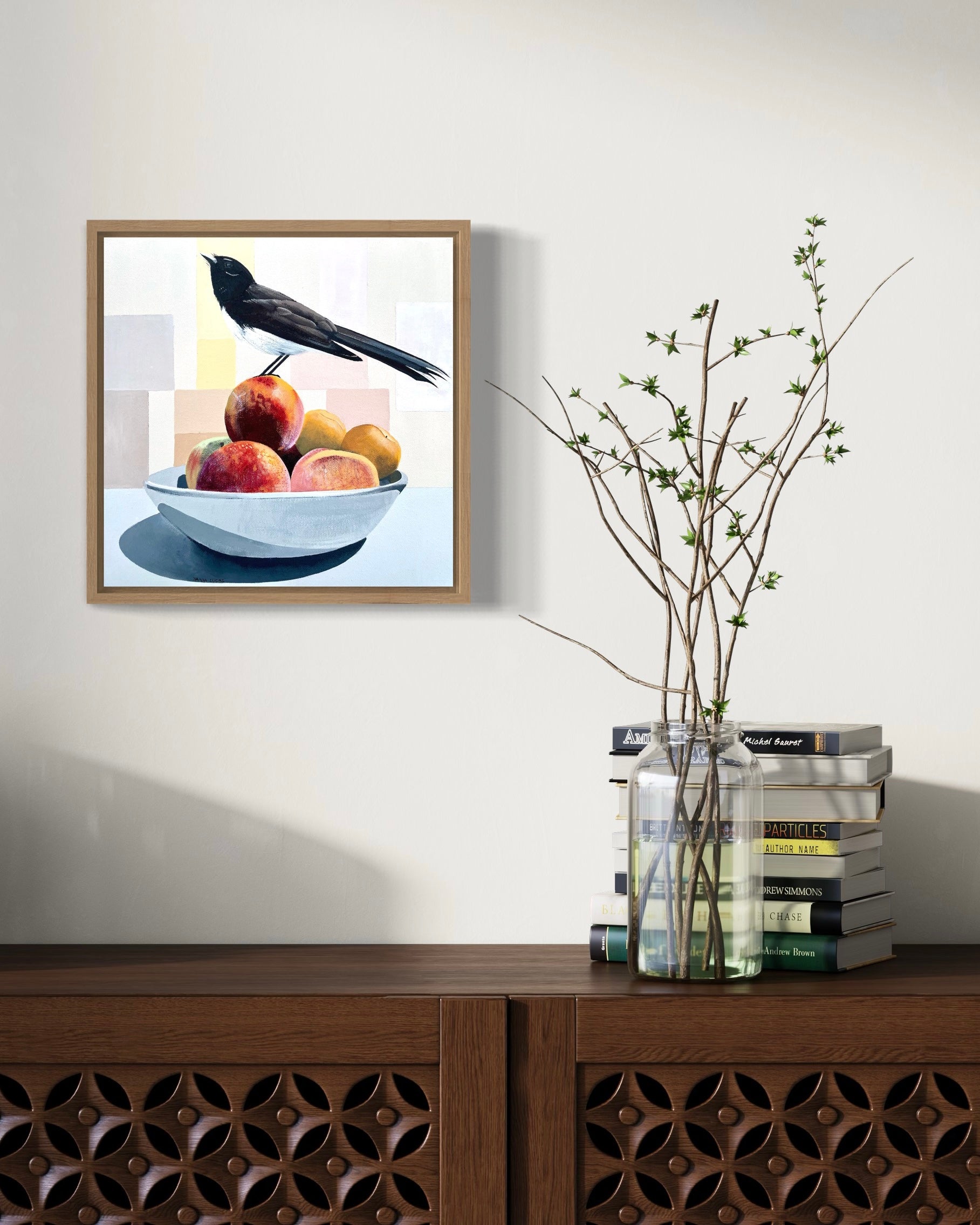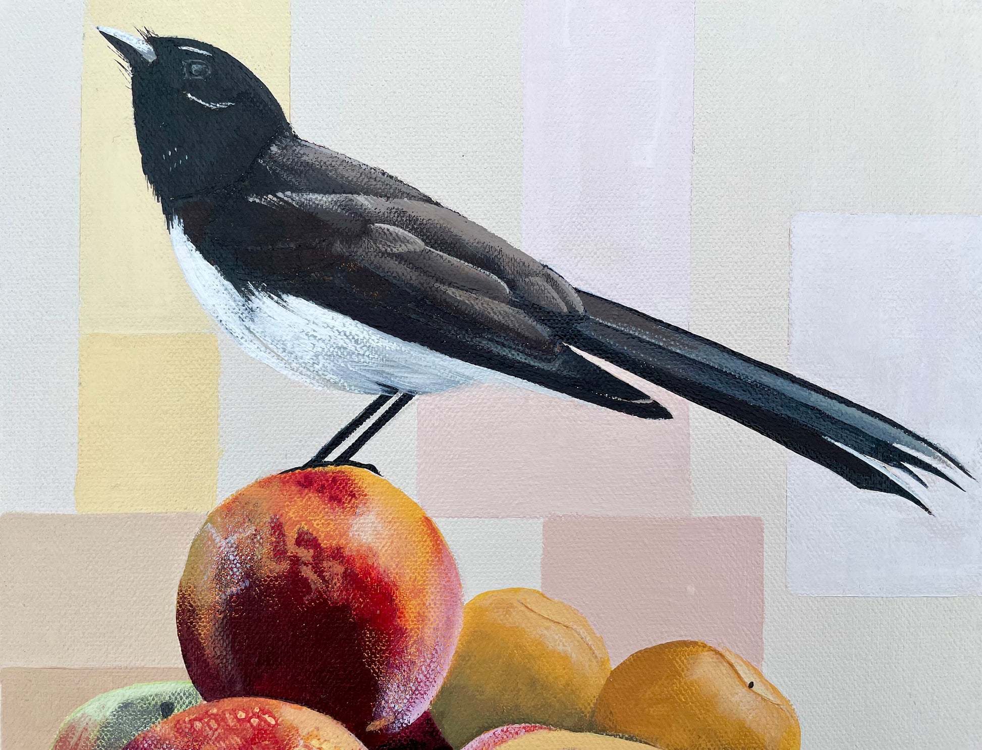 “Ready To Fly” features a beautiful Willy Wagtail Bird perched ready to embrace the sky. The Artist photographed the wild bird and painted it.