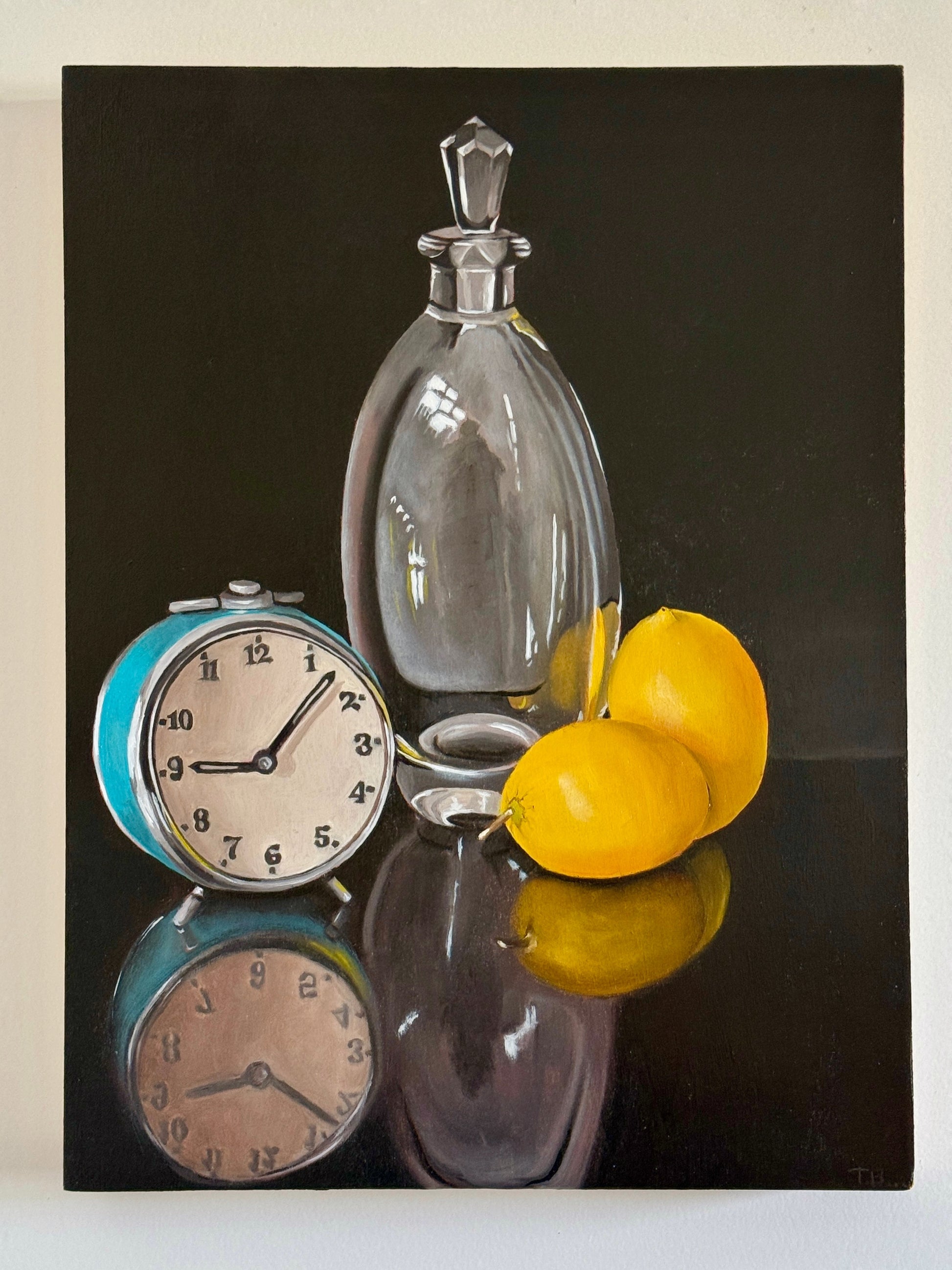 I found the clock in a flea market in Prague this year, and the decanter from a vintage market in Geelong. I have used the clock to represent time and added lemons with a glass decanter to show that it’s time to make limoncello.
